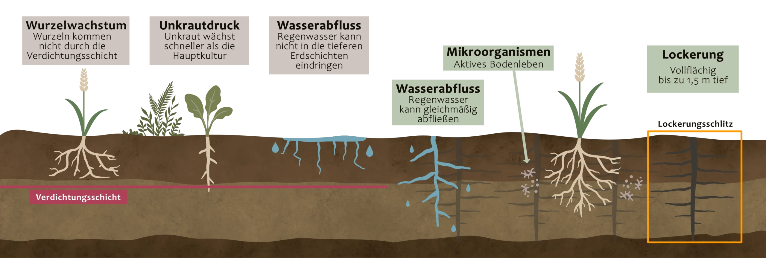 Wasser kann nicht in tiefere Erdschichten eindringen, Nährstoffe sind schlechter verfügbar, und das Wurzelwachstum wird durch die Verdichtung gebremst. Mikroorganismen sind kaum aktiv, der Boden wirkt leblos – mit direkten Auswirkungen auf das Pflanzenwachstum und die Erträge.