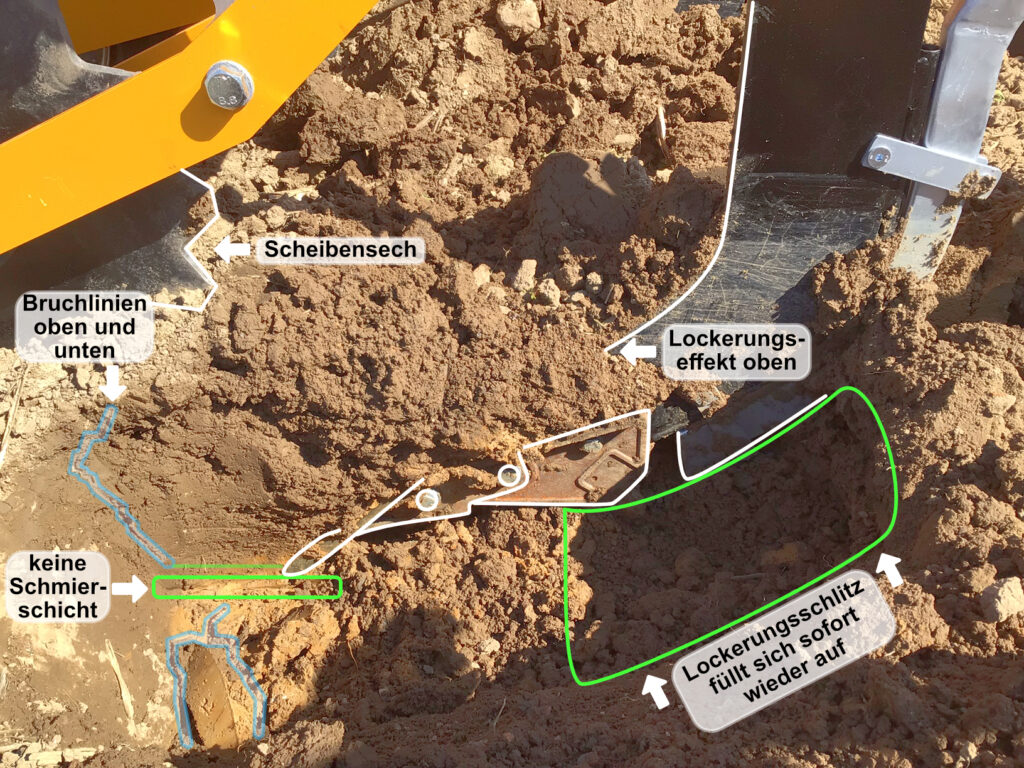 Deutlich erkennbar ist, wie das Scheibensech den Oberboden einschneidet und erste Bruchlinien in die Tiefe einleitet. Dadurch läuft der Zinken im bereits geöffneten Boden – das reduziert den Verschleiß erheblich.